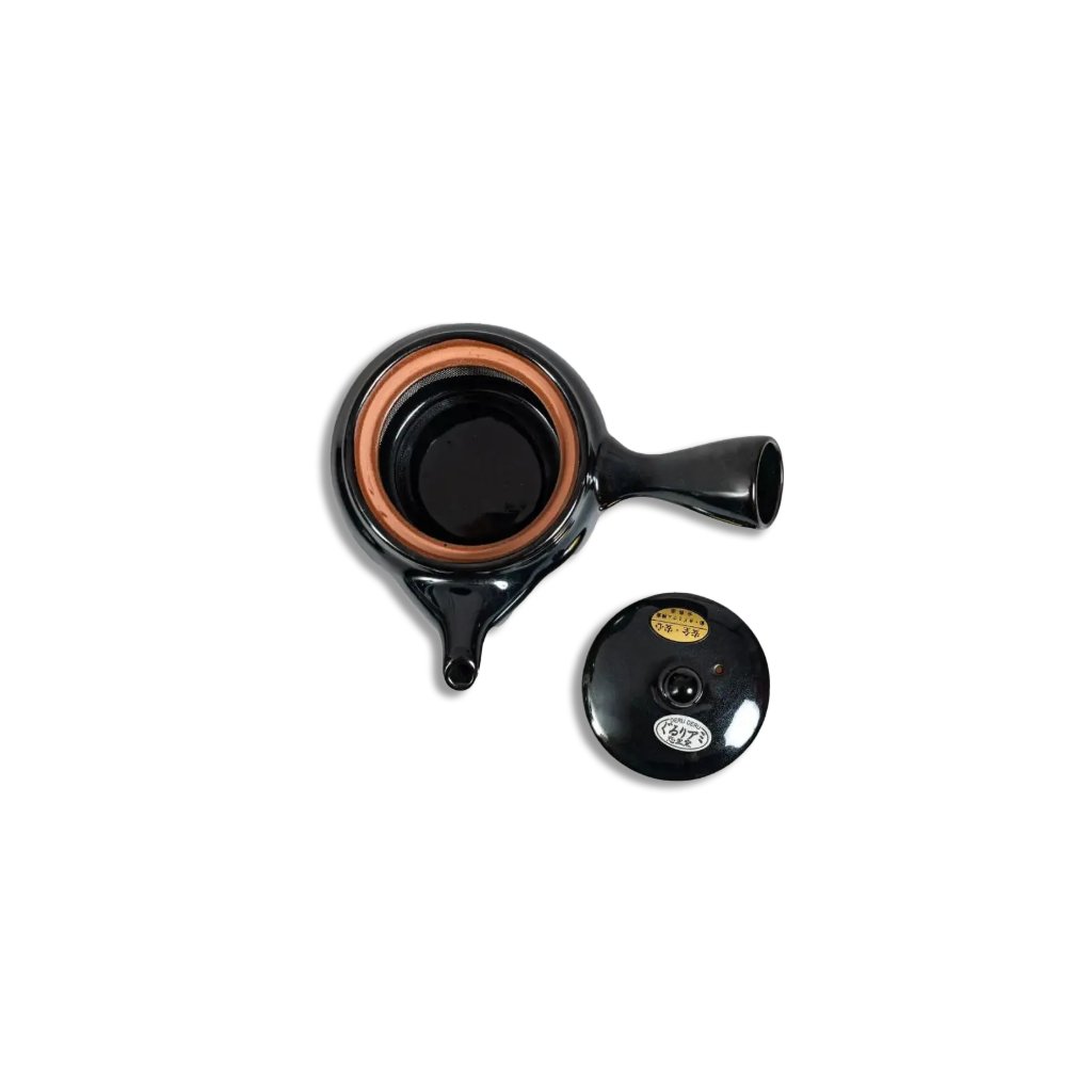Tradiční japonská konvička kyusu na sypaný čaj s bočním uchem, kovovým sítkem a lesklou černou glazurou. Elegantní čajová konvička z glíny zaujme i jemně přiznaným odstínem přírodní hlíny na okraji.