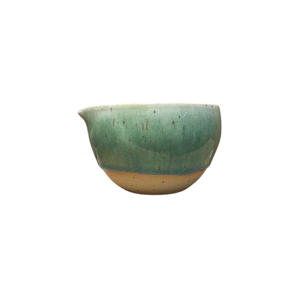 Matchawan TAKI nese v japonštině význam „vodopád“ – a přesně tak působí i jeho glazura. Jemná zelená plocha se směrem k okraji zklidňuje a přechází do tenké modré linky, která misce dodává svěží, čistý akcent. Výsledkem je harmonický kousek, který přirozeně zapadne do každodenního matcha rituálu.