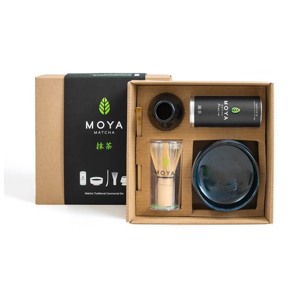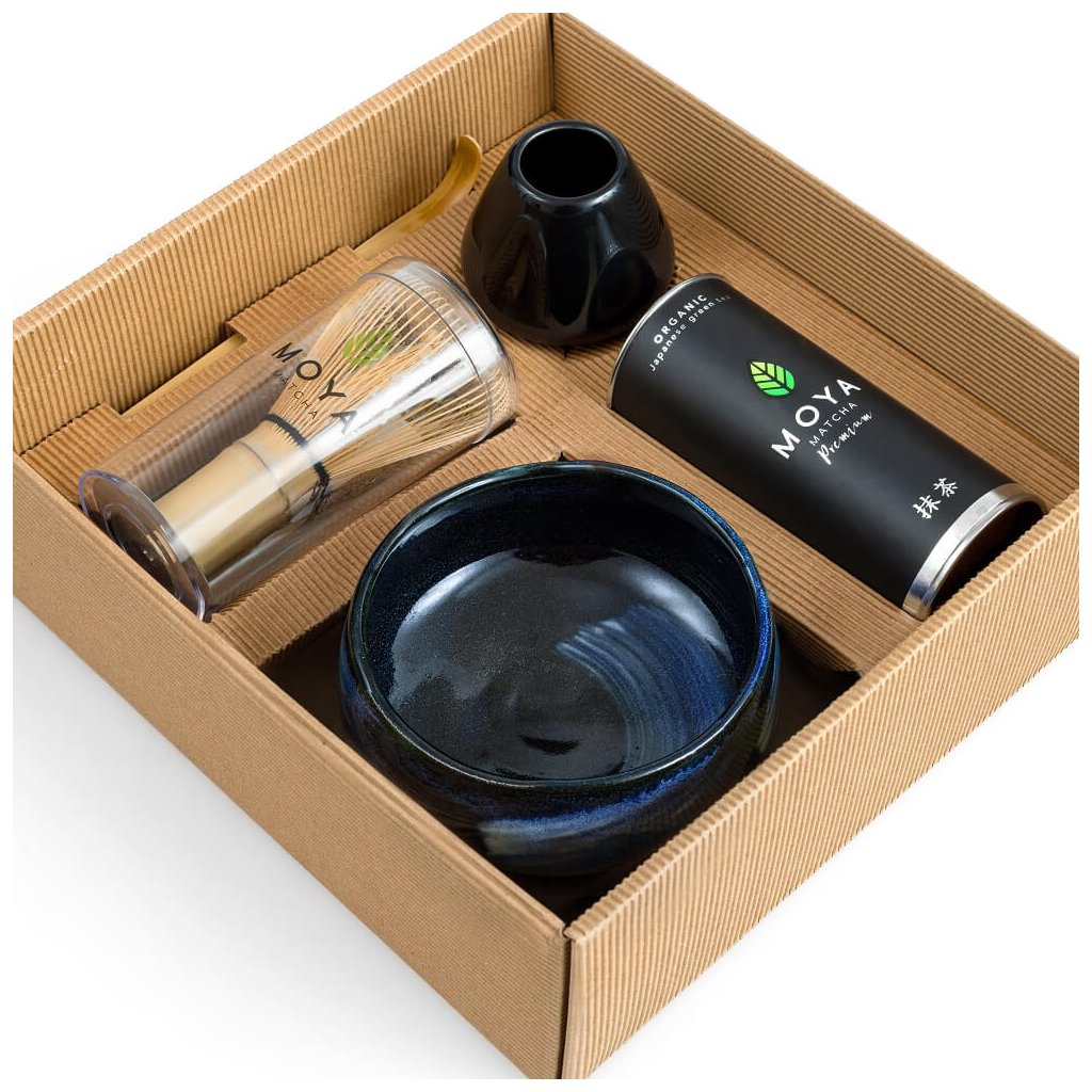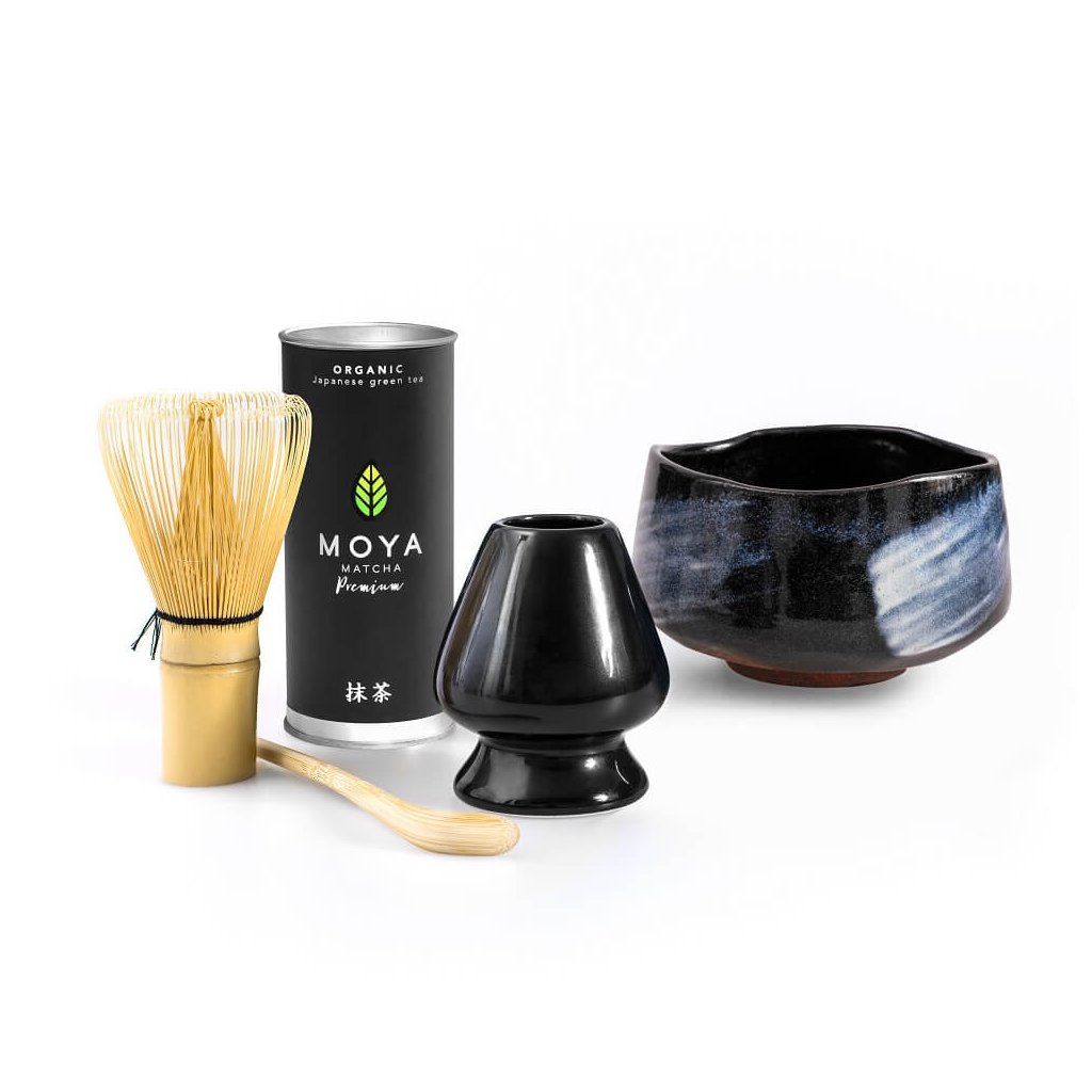 Tradiční sada na přípravu matcha obsahuje: Matcha Premium 30g, chasen, stojánek na chasen, bambusovou lžičku chashaku, a misku matchawan.
