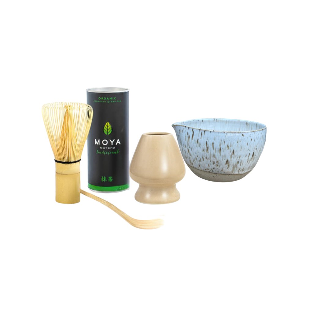 Tradiční sada na přípravu matcha obsahuje: Traditional matcha 30 g, chasen, stojánek na chasen, chashaku - bambusovou lžičku a misku matchawan.
