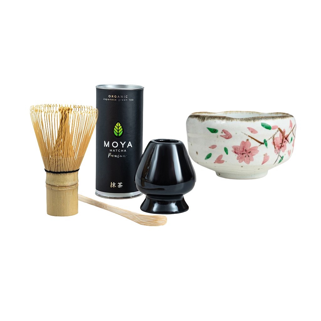 Tradiční sada na přípravu matcha obsahuje: 30 g Premium matcha, chasen, stojánek na chasen, chashaku - bambusovou lžičku a misku matchawan.