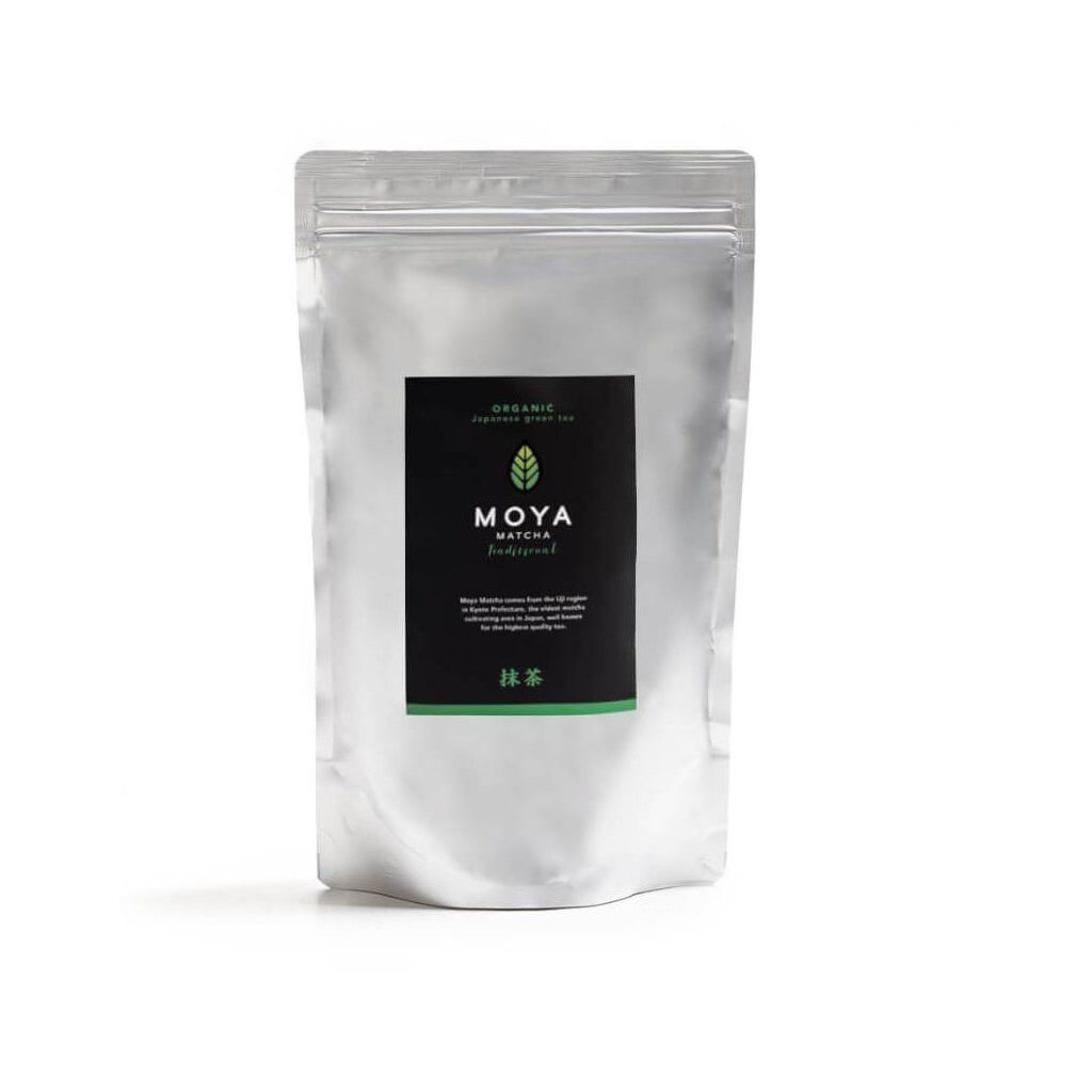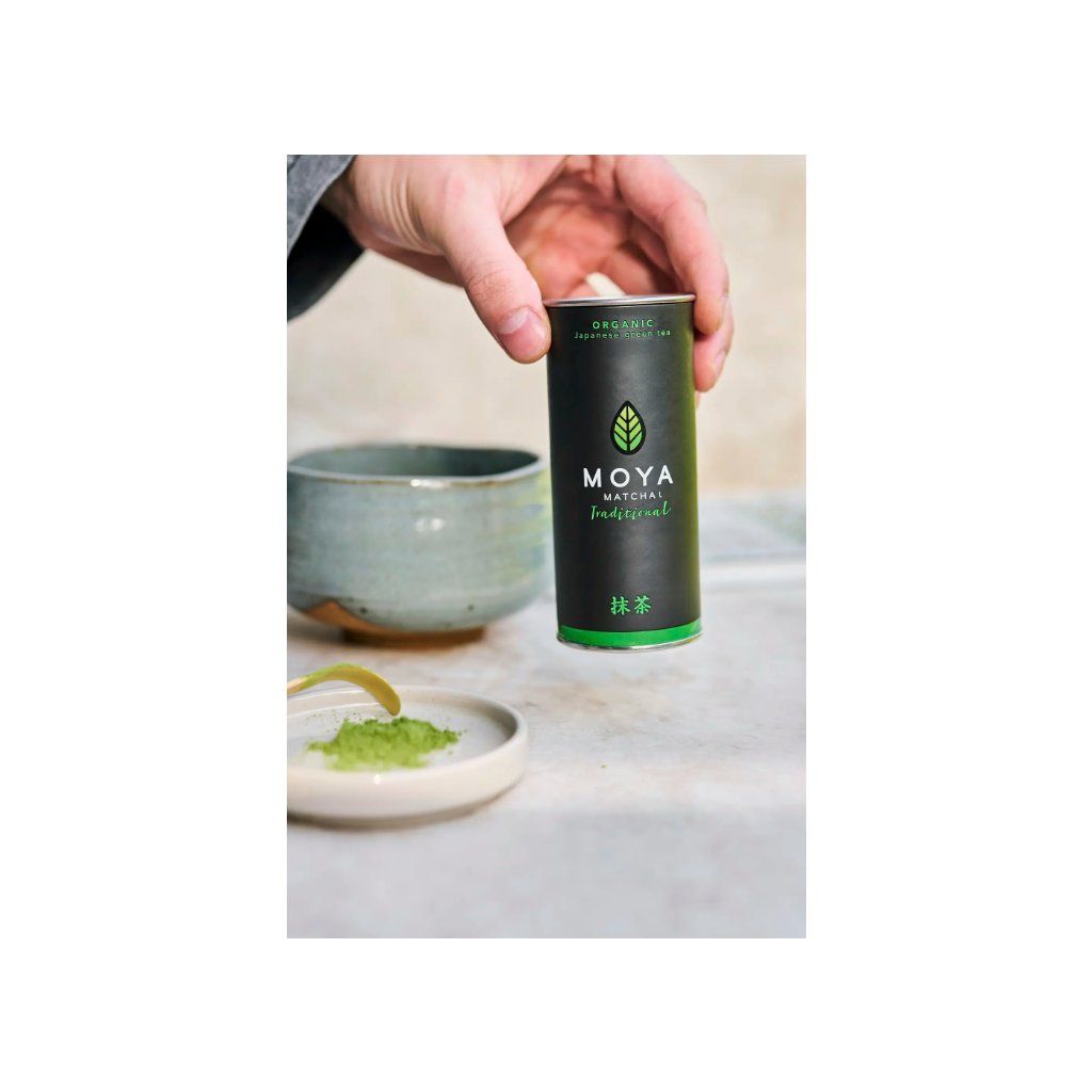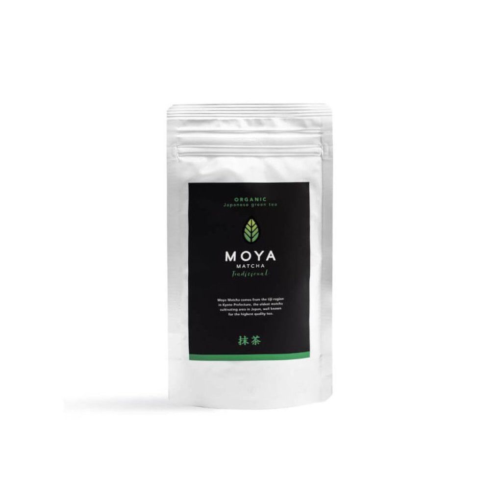 Moya Organic Matcha Traditional je k dispozici v balení po 30, 50, 100, 250 g a 1 kg nebo ve variantě Matcha Traditional TO GO!