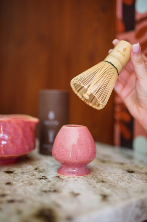 Nezbytná výbava pro každého milovníka matcha! Tento elegantní, růžově glazovaný stojánek na matcha metličku pomáhá udržet chasen v ideálním tvaru, čímž výrazně prodlužuje jeho životnost a odolnost. Stojánek na chasen, v Japonsku známý jako naoshi, je nepostradatelnou součástí sady pro přípravu matcha každého milovníka tohoto čaje.
